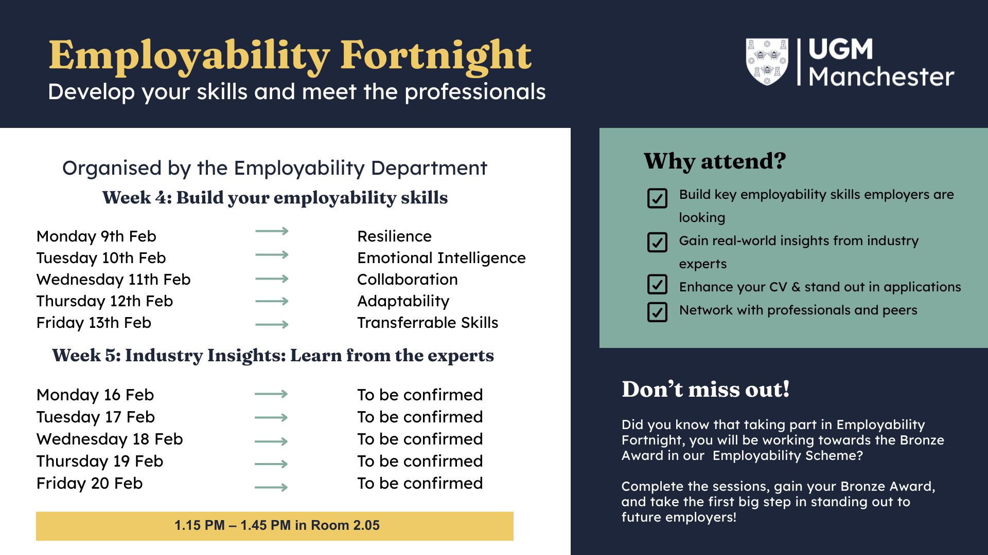 Join us for Employability Fortnight, a two-week programme designed to help you build the skills employers are looking for and gain valuable insight into the world of work.